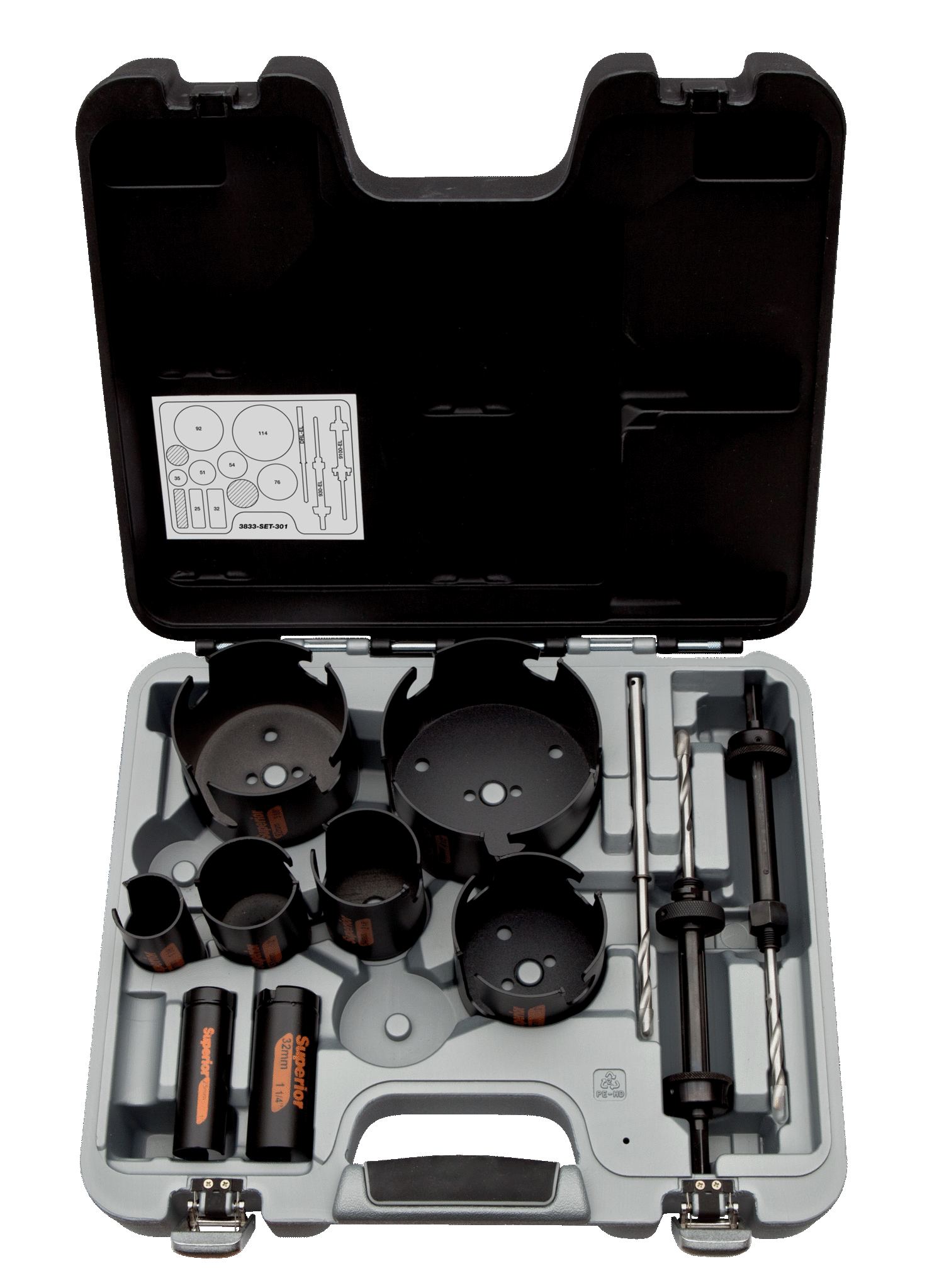 - Σετ ποτηροτρύπανων Superior™ που περιλαμβάνουν τα πιο δημοφιλή μεγέθη για ξυλουργούς, υδραυλικούς και ηλεκτρολόγους. Τα σετ περιλαμβάνουν επίσης τον οδηγό ποτηροτρύπανου γρήγορης εξαγωγής.